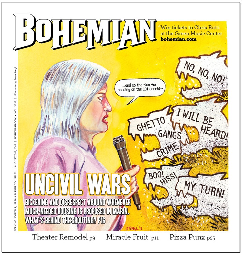 How did this happen? After all, as Carla Marinucci pointed out in a recent San Francisco Chronicle piece on the county’s current incivility, Bush-era Marin County was supposed to be a Greenpeace mecca of laissez-faire hippies soaking in backyard hot tubs. It continues to be caricatured as a rosy-vibe utopia policed by the handholding Kumbaya Patrol, not a place where mob mentality sweeps town halls.