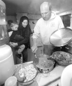 Not tonight, though. Tom and his wife, Tara, holding their 22-month-old son, Tevin, stand and chat for a bit, but then they head right out the door, with their bulging canvas bag. Bob and I stand there for a few seconds in the sudden quiet. Then Bob turns and asks a very natural question: “You want something to eat?”
