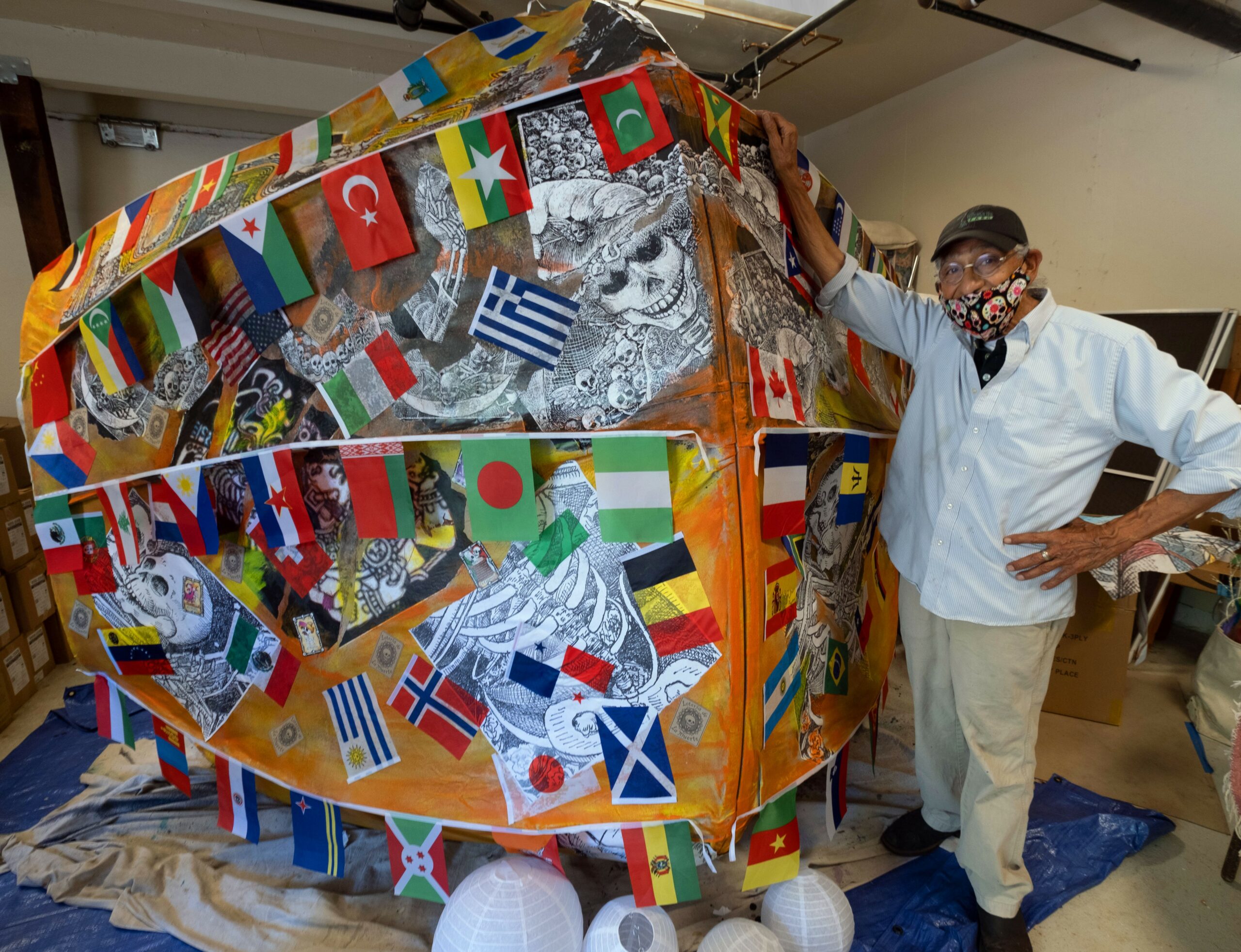 While the exhibition includes traditional elements, the altars and artworks created each year often reflect current themes, and this year is no exception. Perez’s installation will include an 8-foot tall mask (pictured), with layers of imagery and meaning, a statement about the current COVID-19 pandemic and a tribute to those who have lost their lives to the virus.