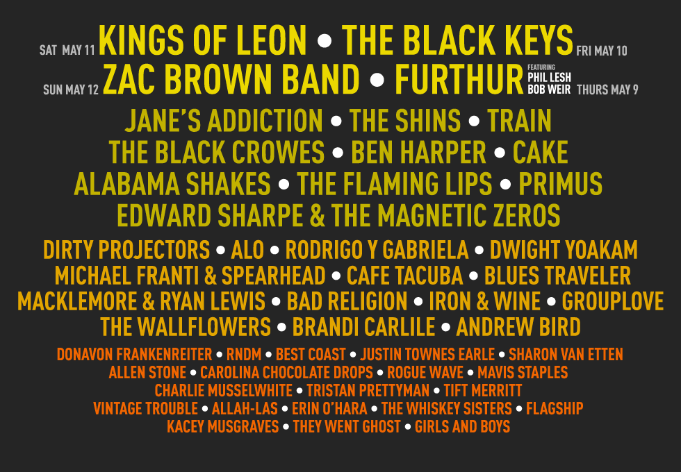 Confirmed acts for Saturday, May 11 include Kings of Leon, Jane’s Addiction, Bad Religion, Ben Harper, Edward Sharpe, Dwight Yoakam, Iron & Wine, Best Coast, Sharon Van Etten, Tift Merritt, Carolina Chocolate Drops, Allen Stone, Donovan Frankenreiter, and RNDM.