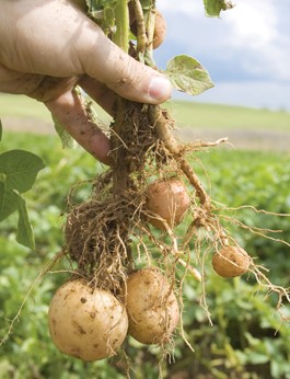 Boone stores his potatoes in burlap sacks in a barn built in 1850 and sells them on Saturdays at the Santa Rosa Farmers Market. They’re also available at the Red Barn Store at Oak Hill Farm in Glen Ellen and at Berkeley Bowl in Berkeley. Depending on the variety, they sell for $2 to $3 a pound. One of his favorite recipes for fingerlings, which he gives out freely, suggests slicing them in half and roasting them in olive oil. They’re delicious.