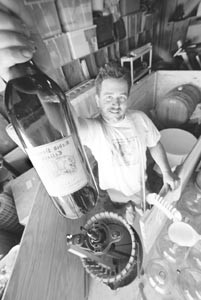IN MARKETING parlance, Jan Anderson’s winemaking setup would be called “rustic.” In all blunt honesty, it’s downright primitive. The 35-year-old Healdsburg resident (whose first name is pronounced “yawn”) tastes and blends his wine in the garage of his rented house. The entire operations of Rabid Possum Cellar–one barrel, a few glass jugs, and right after the crush a few food-grade plastic garbage cans–fit into a hinged plywood box that encloses the wine and protects it from swings in temperature. In an uninsulated garage, those can be extreme; right now, for example, the garage is at least 85-90 degrees, estimates Anderson. “I used to keep a thermometer out here, but it was just giving me head games,” he says with a good-natured shrug. “If this is what I’ve got, I can’t stress about it. I just do the best I can.”