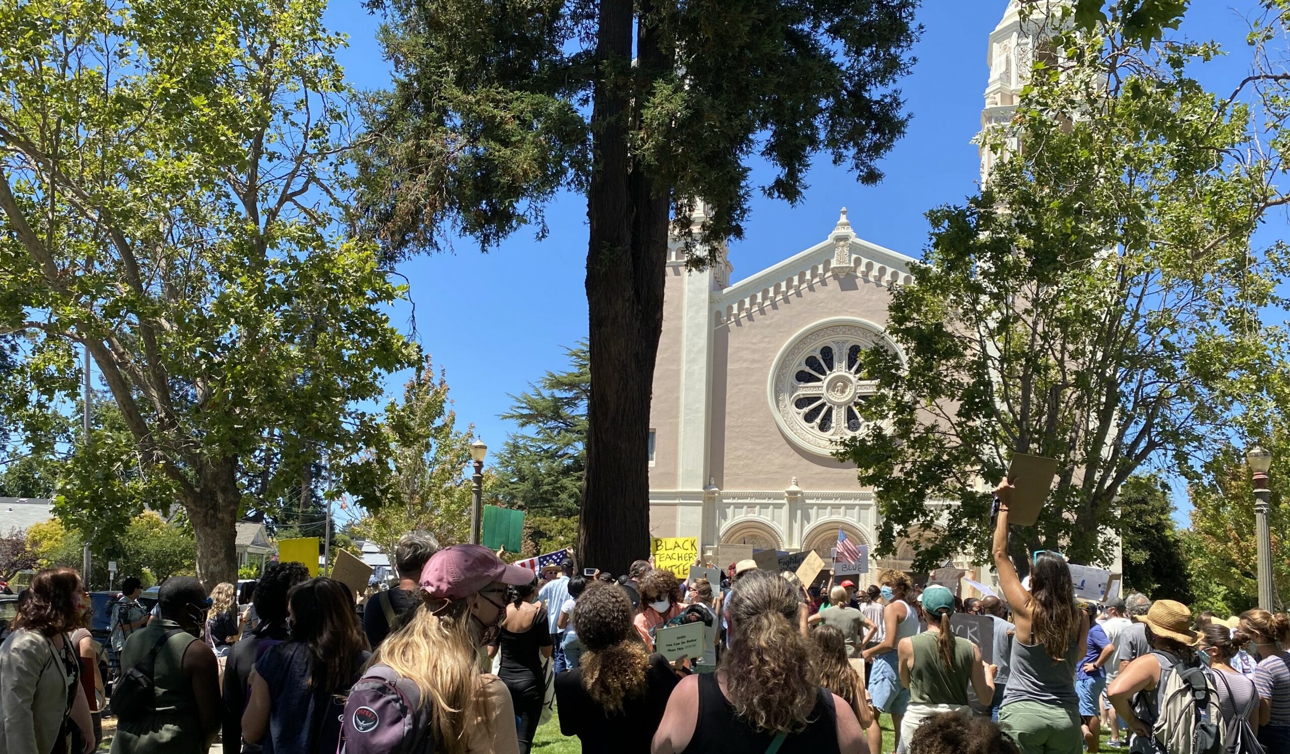 Hundreds of protesters crowded the St. Vincent’s Church Plaza on Sunday as part of a demonstration organized by St. Vincent’s High School alum Aidan Lynch and local Black Lives Matter supporters. Central to the protest was the firing of two Black women staff members at the Catholic High School.
