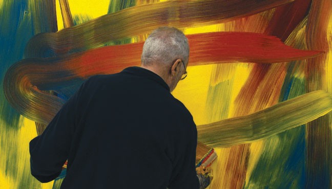 Richter, arguably the most eminent living painter, painstakingly scrapes his canvases with oversized squeegees, and one learns more about Richter’s art from watching him paint than by having it explained. The work ranges from soft Vermeer-like portraits to slate, tar and charred abstract canvases. In 2009, we watch him wrestling with a series of predominantly yellow and red canvases, as artificially bright as mustard and ketchup. He brings in edged tools to grade them into dense and dynamic pictures, dragging a butcher knife to scrape the surfaces and reveal new layers.
