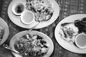 The Garm Poo Tod ($9.95), deep-fried king crab claws dipped in tempura batter and served with sweet and sour sauce, seemed overpriced. The half dozen claws were tiny, each containing but a semi-mouthful of sweet flaky meat. They were covered in a crunchy batter and served with more of that monochromatic sweetish sauce.