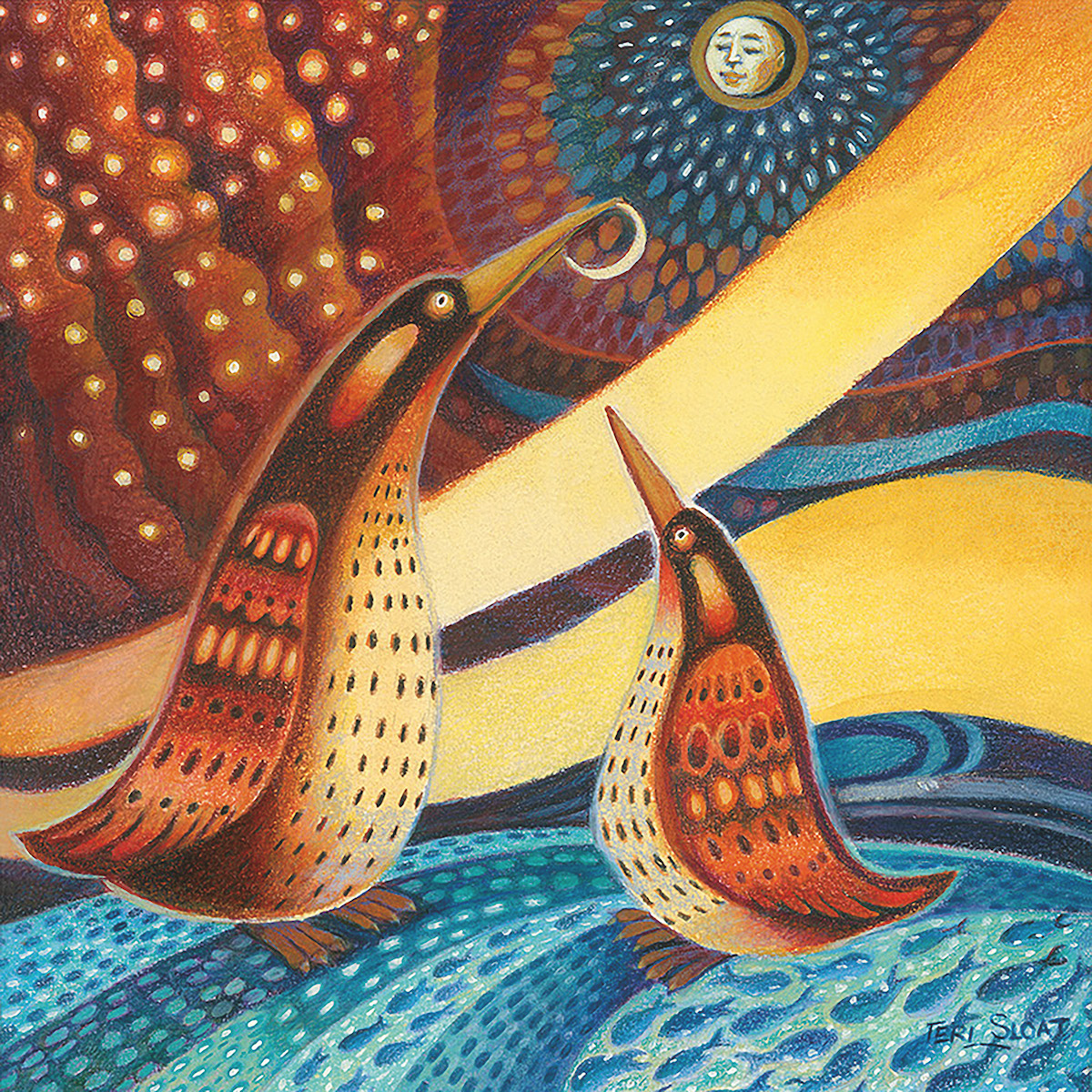 Though she is always careful to attribute her inspirations to their original sources and otherwise avoid appropriation—Sloat feels anyone can craft and create folklore. And she feels that her paintings offer an invitation to create our own stories, our own folklore. Often a speaker in schools, at conferences and in various art programs, Sloat teaches that all folklore starts somewhere, and there’s no reason that it can’t start with us.