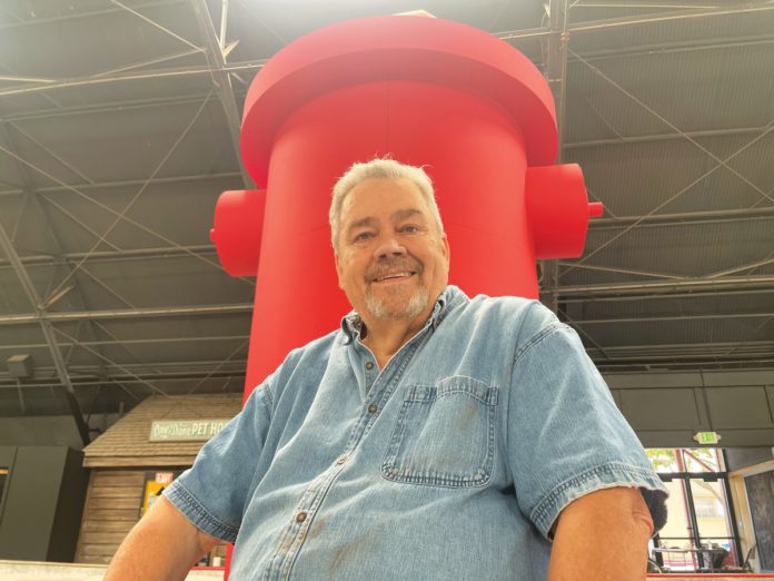 My appointment this week was with Greg Duncan, the fourth director of the show. And as I entered the massive hangar, I marked among the many raised bare plots, the major features of this year’s theme, “hot dogs and cool cats.” There were a mock animal shelter promoting rescues, a 15 foot tall hydrant gushing water, an “altar” for pets departed, cat and dog statues made of scrap, and mock cats and dogs falling from the ceiling on umbrellas in front of a 150 foot wide mural of a hard rain of cats and dogs. And still the 15,000 square feet of gardens had yet to be planted.