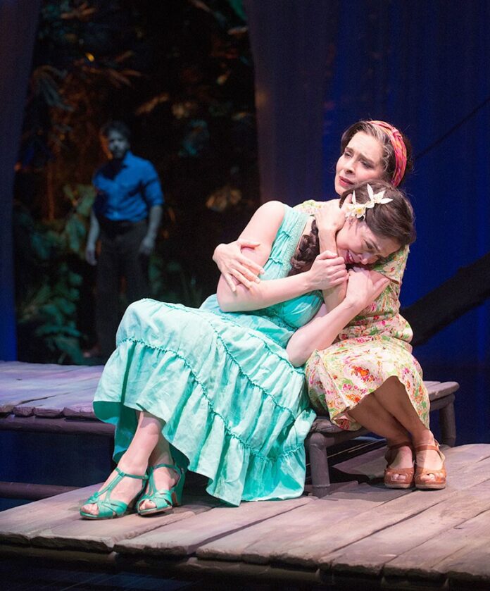 The scenic design by Mariana Sanchez places simple set piecesāa wooden dock, a boat, a framed house on stiltsāabove a glistening splash of watery blue. The video design by Mark Holthusen works wonders, from a glittering sprinkle of stars and the rising and setting of the sun, making us wonder if the whole story is no more than a dream itselfāor perhaps only the echo of life-altering love, nearly found, but lost at last in the depths of the river.